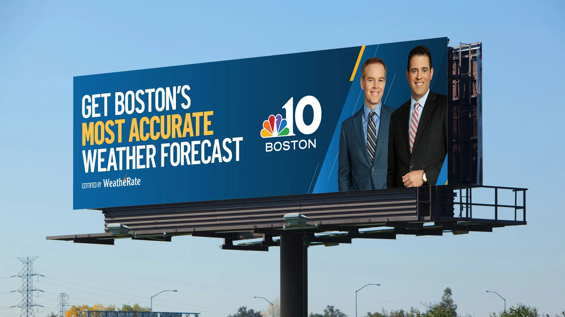 A billboard campaign that promotes the NBC10 Boston Morning Weather team, with Pete Bouchard and Matt Noyes. The main purpose was to remind viewers that each forecast is certified by WeatheRate, the only weather forecast verification company in the United States.